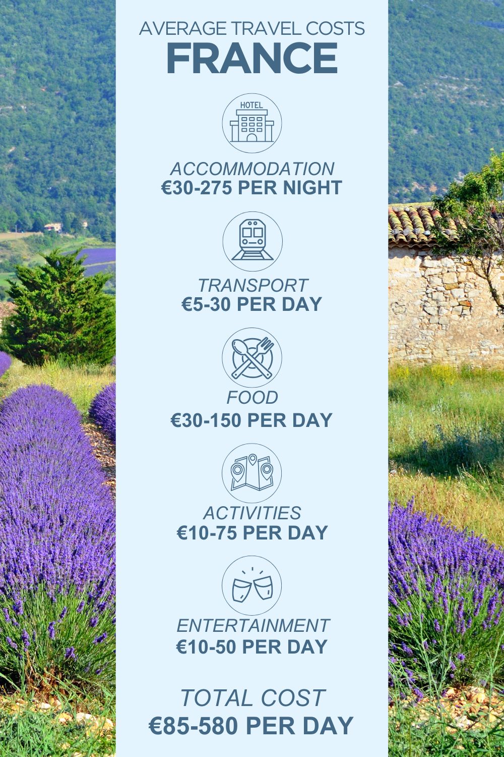 Here, I’ve worked out an average cost for one person for one whole day in France, assuming they use transport, take part in a paid activity, have an evening out, eat three meals a day and drink one coffee, one glass of beer or wine and one cocktail. This is also assuming that some costs, such as accommodation, are split between two people.