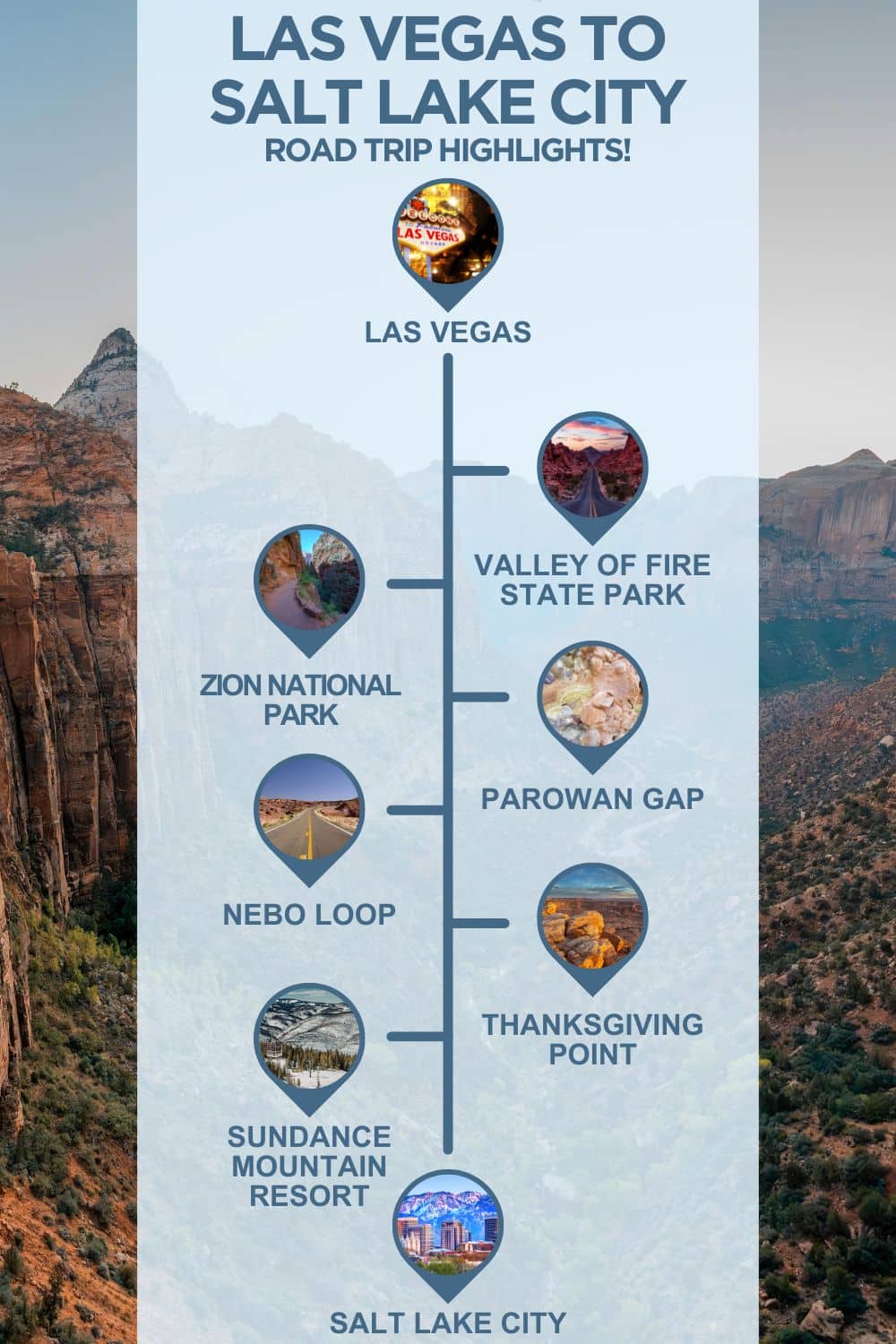 An infographic with images of Utah, text reading "Las Vegas to Salt Lake City road trip highlights" and 6 stops with images between the two