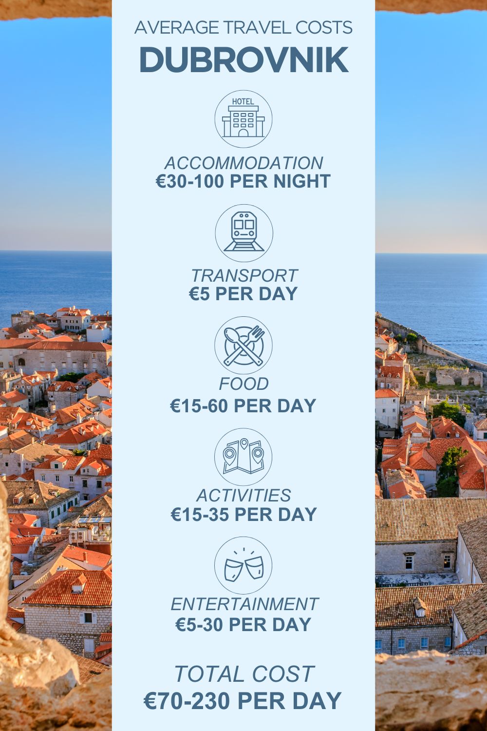 In total, you can expect to spend around €70-230 a day during a trip to Dubrovnik, Croatia. The low end takes into account those staying in a hostel, pretty much eating street food and doing the bare minimum of paid-for activities and entertainment.