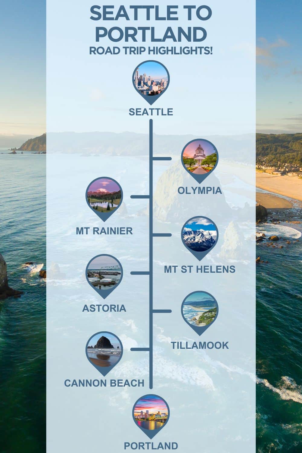 i am doing a mothers and daughters trip from port and oregano to Seattle and will be staying in oregano for a few days driving up to Seattle can you recommend a place in between both locations that would be good stay. I have two days in between both places. Would like to see mount Helen and cannon beach.