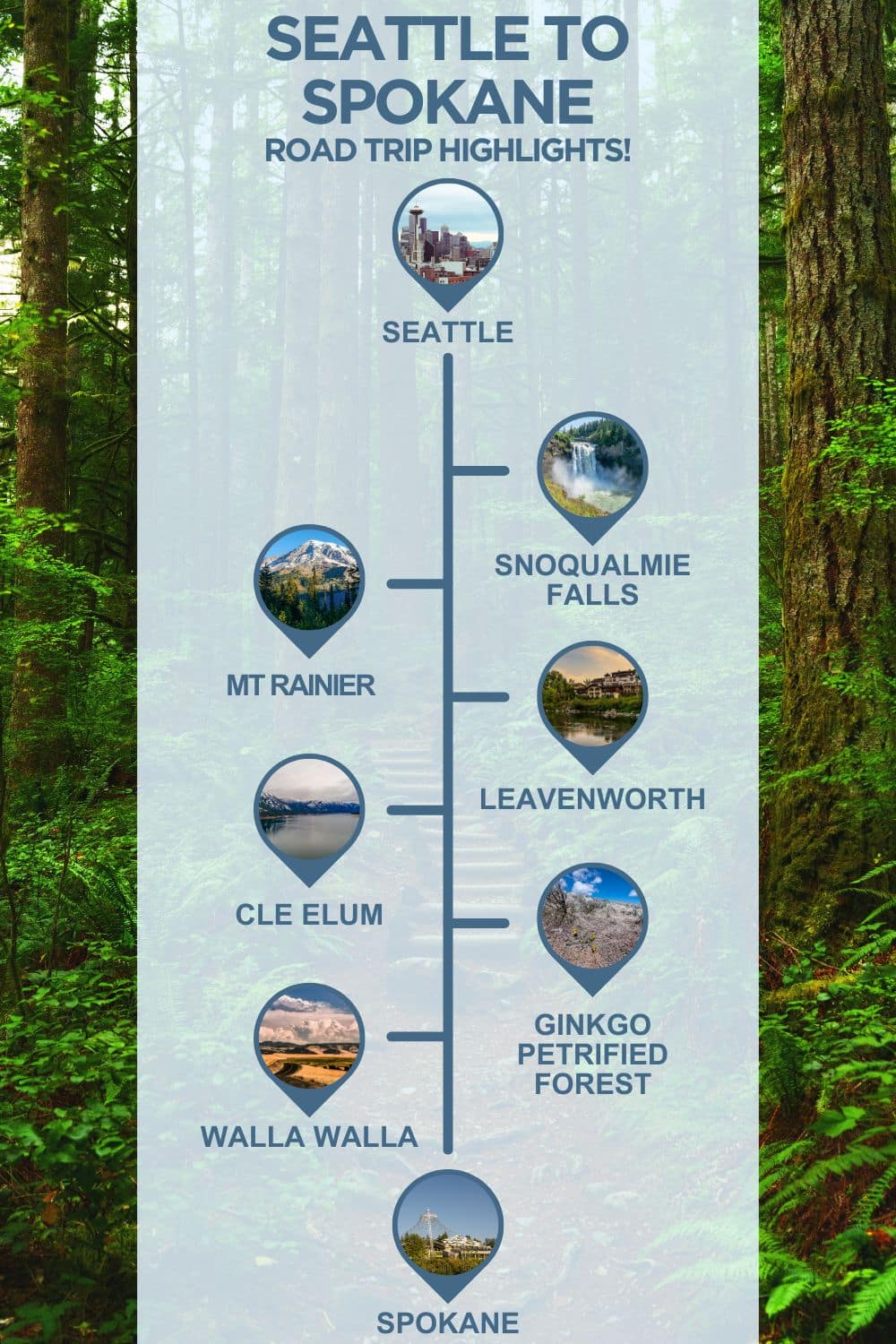 An infographic with images of Washington, text reading "Seattle to Spokane road trip highlights" and 6 stops with images between the two